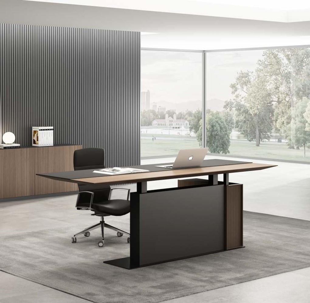 Trendy and Hi-tech are combined together in the LEAP Height Adjustable Executive Desk(HAT). Healthy Office is popular but most of HAT looks more staff table. But LEAP table with nice edge, solid but modern base. Of course, it is more important that we use silent mechanism with functional cable management. The table comes with a side unit that has two drawers and a shelf for storage. Made with high-quality veneer, this executive table is sure to last for years.